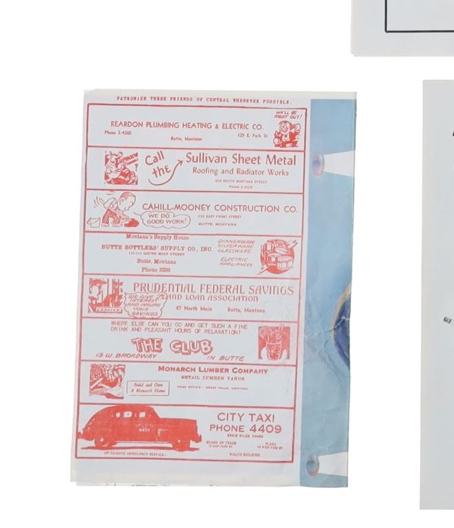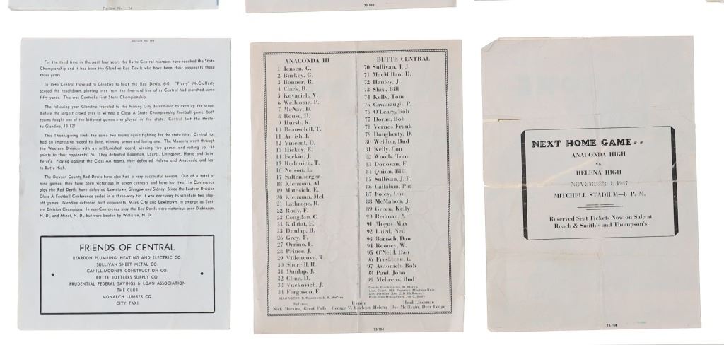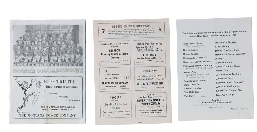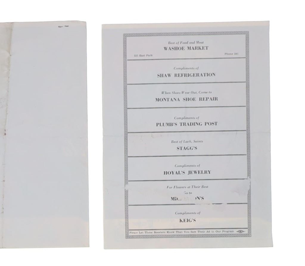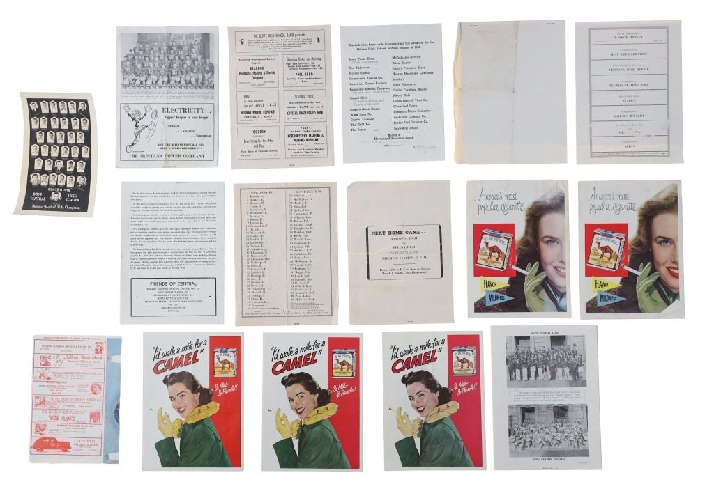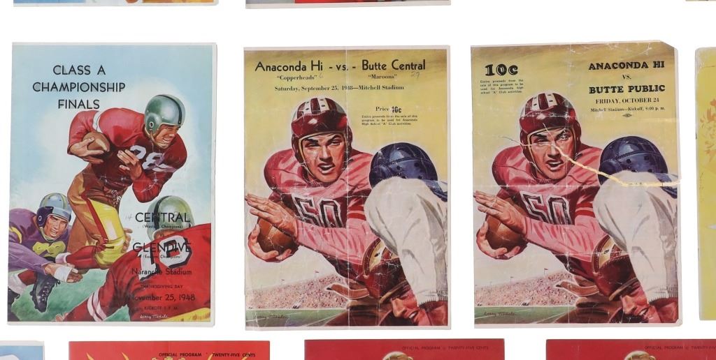 For your consideration is this collection of college and high school football programs from between 1948-1952. The programs feature rules of the games, ref signals, score cards, player rosters and advertisements for things such as: Coke-a-Cola, cigarettes, services and more. The programs featured in this lot are: State Class A Championship between Butte Central Maroons and Glendive Red Devils 1952, Class A Championship between Butte Central and Glendive 1948, Gallatin Hawks vs Butte Central, Butte vs Central 1947, Anaconda Central Saints vs Butte Central Maroons 1948, Helena Bengals vs Butte Central Maroons 1948, Anaconda High vs Butte Public, Anaconda High vs Butte Central 1948, Utah State vs MSU 1952 (2), Idaho vs Montana 1951, Butte Central Maroons vs Gallatin High 1949, Wyoming vs Montana 1952, Wyoming University vs Montana University 1951, Butte Central vs Gallatin High 1948, and lastly, a photo card of the Boys Central High School Championship Football team in 1948. All of the programs feature colored images. The programs show good condition with wear and slight fading from their vintage age, with one showing a torn front page. The programs are all in good, readable condition and come in plastic slips to preserve their condition. The largest measures 11" L x 8 5/8" W while the smallest measures 9 3/4" L x 6 7/8" W. The photo card measures 9 5/8" L x 5 7/8" W.