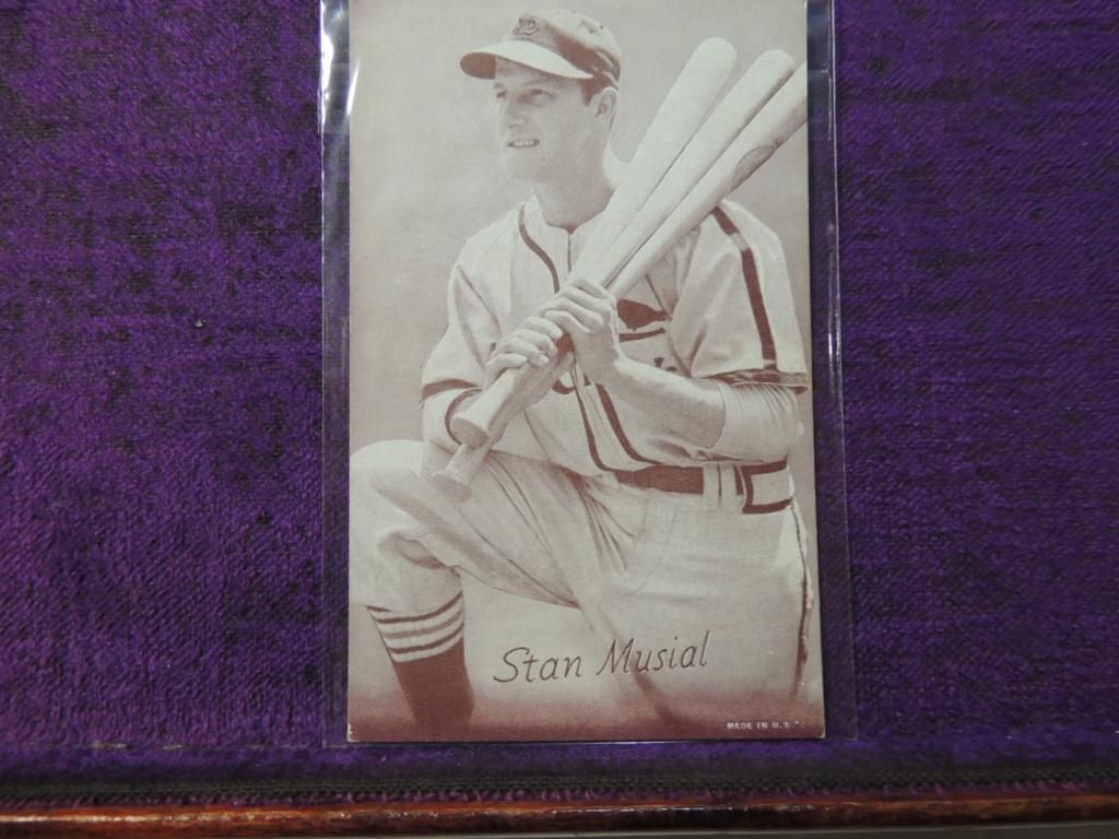 1947-1966 EXHIBIT STAN MUSIAL BASEBALL CARD. BASEBALL CARD. TRADING CARD. COLLECTIBLE. VINTAGE CARD. PROTECTIVE PLASTIC SLEEVE. RARE CARD. AS SHOWN. SEE PHOTO FOR MORE DETAILS.