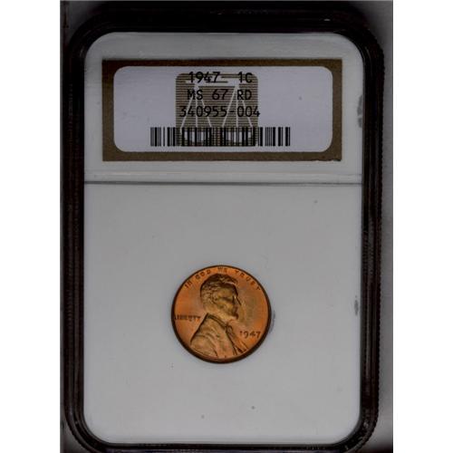 <B>1947<1C> MS67 Red NGC.</B></I> A remarkably beautiful rose-red Superb Gem. Vivacious luster sweeps undisturbed fields and devices. Census: 10 in 67, 0 finer (5/06).