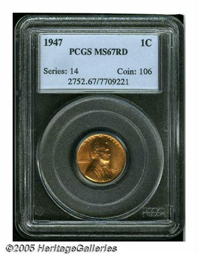 <B>1947<1C> MS67 Red PCGS.</B></I> A flaming golden-orange Gem that is by far the most difficult of the 1947 Lincoln issues in MS67 Red condition. Beautiful spot-free surfaces. Population: 7 in 67, 0 finer (6/05).<BR><I>From The William Bickel Collection, Part One.</B></I>