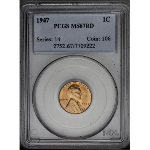 <B>1947<1C> MS67 Red PCGS.</B></I> Outstanding golden-orange surfaces and dynamic luster. The most difficult of the 1947 Lincoln issues in Superb condition. Population: 10 in 67, 0 finer (3/06). <BR><BR><B>Important notice:</B> Heritage usually auctions material at the rate of 200-250 lots per hour. On some occasions eBay Live bid software or the Internet may not be able to keep up with the pace of the auction. We recommend placing a realistic absentee bid now as insurance to avoid disappointment. Occasionally the auctioneer may eliminate or reject an eBay Live bid, and the auctioneer may also reopen a lot after the close of the eBay live bidding (usually because we missed an audience bid), and may reject your bid even if it shows you as the winning bidder. By bidding via eBay Live, you agree that Heritage may award the lot to another bidder at its sole discretion under the circumstances described above or any other reasonable circumstances. Since eBay bids are not shown to us until we open the lot on the floor, we treat those bids just like floor bids. In most cases the floor responds before the eBay bid is presented to us, due to Internet lag time, so for consistency we have made it a policy that floor bids are always considered first over tie eBay live bids. Also please note that all Heritage lots purchased through eBay Live carry a 20% Buyer's Premium. Please make sure you read the Terms and Conditions before you bid. This lot is being auctioned in conjunction with a live floor auction by Heritage Galleries & Auctioneers. All final auction and invoice information will be supplied by Heritage Galleries & Auctioneers, and all other information should be considered preliminary. Lot:672 <BR><BR><B>Winning Notification and Billing:</B> After the FINAL session in this auction is complete, Heritage will send e-mail and snail mail invoices. This process normally takes several days. All final auction and invoice information will be supplied by Heritage Galleries & Auctioneers, and all other information should be considered preliminary. <BR><BR>This auction will be conducted on a live auction floor and over the Internet through eBay Live. If you choose to place an absentee bid, please take a moment to <font color='#0000ff'><u><a href='http://pages.ebay.com/liveauctions/help/before/laabsentee.html'>learn how eBay Live absentee bidding works</a></u></font><font color='#000000'>
