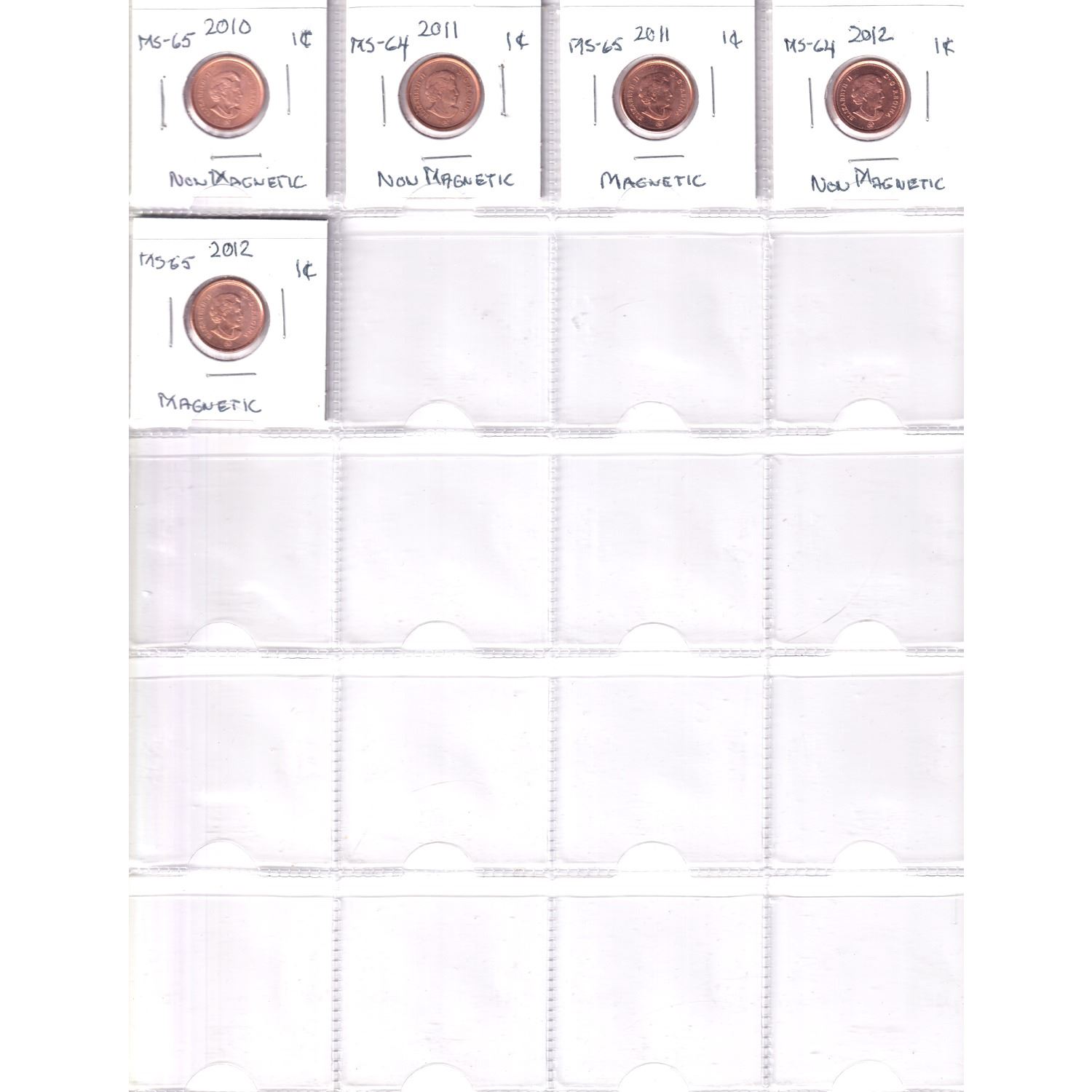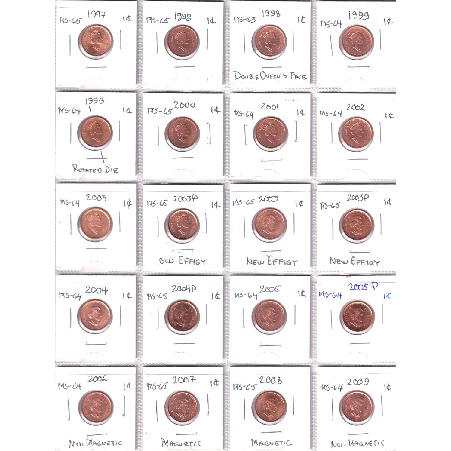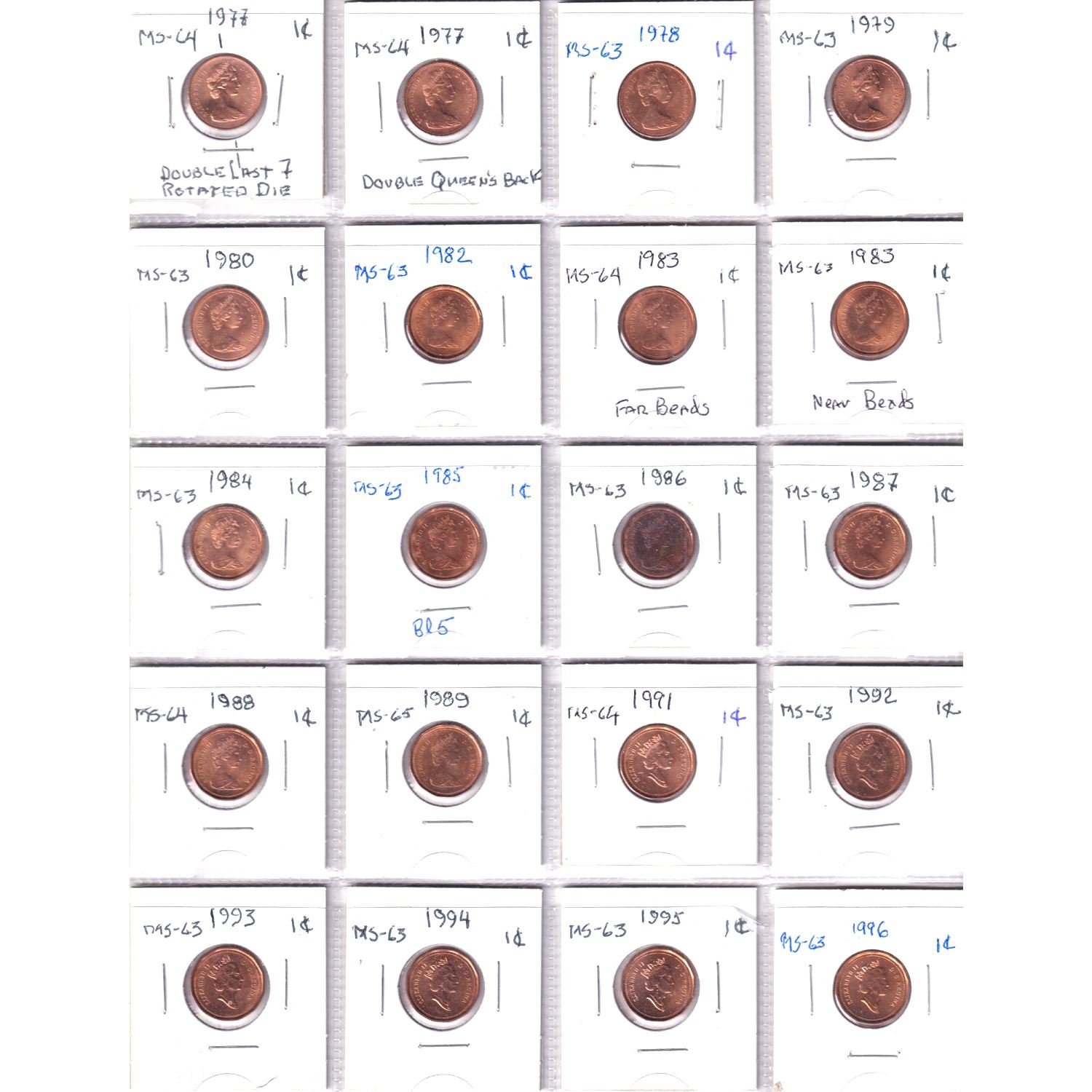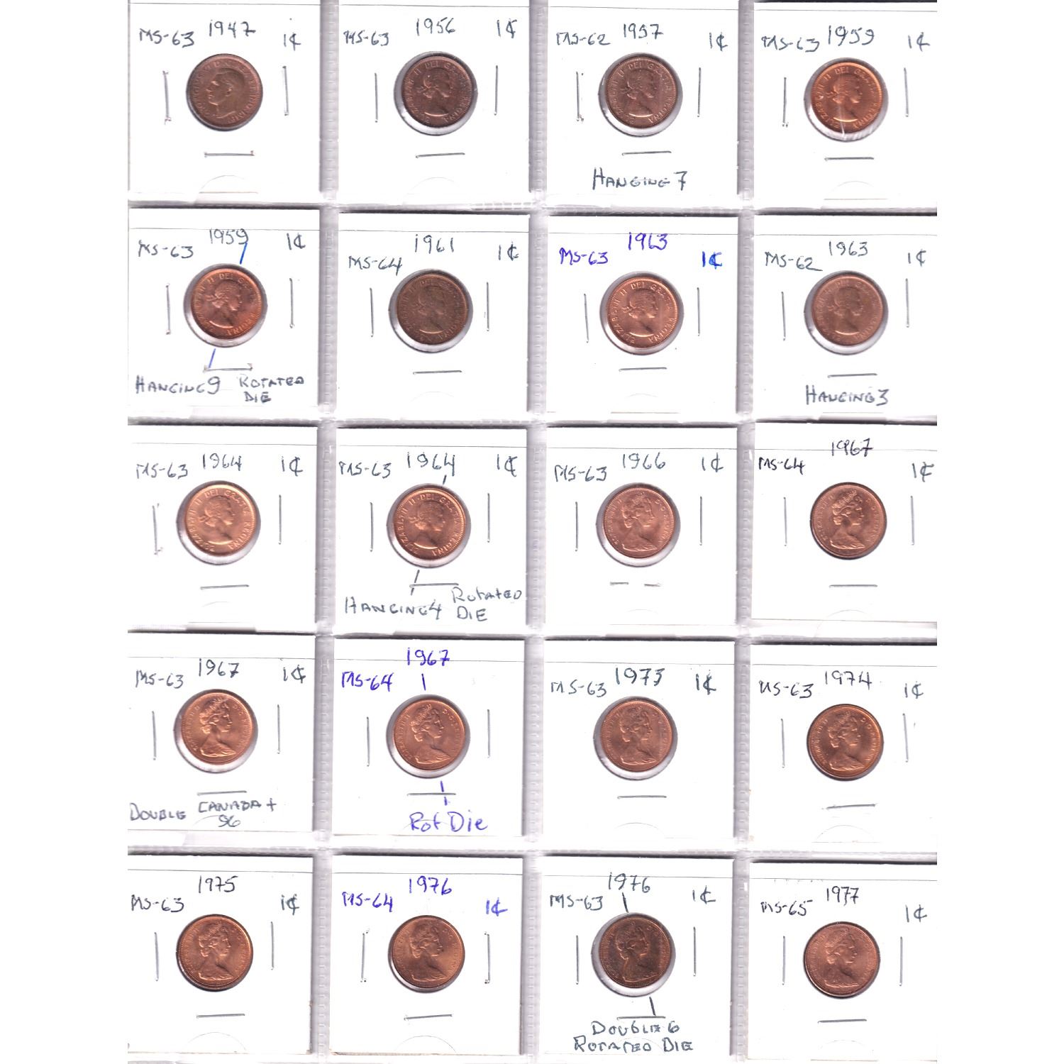 1947-2012 Canada 1-cent coins: lot includes various grade from MS-62 up to MS-65, lot contains many varieties such as rotated dies, Doubling and Hanging varieties. Please view image for details. 65pcs