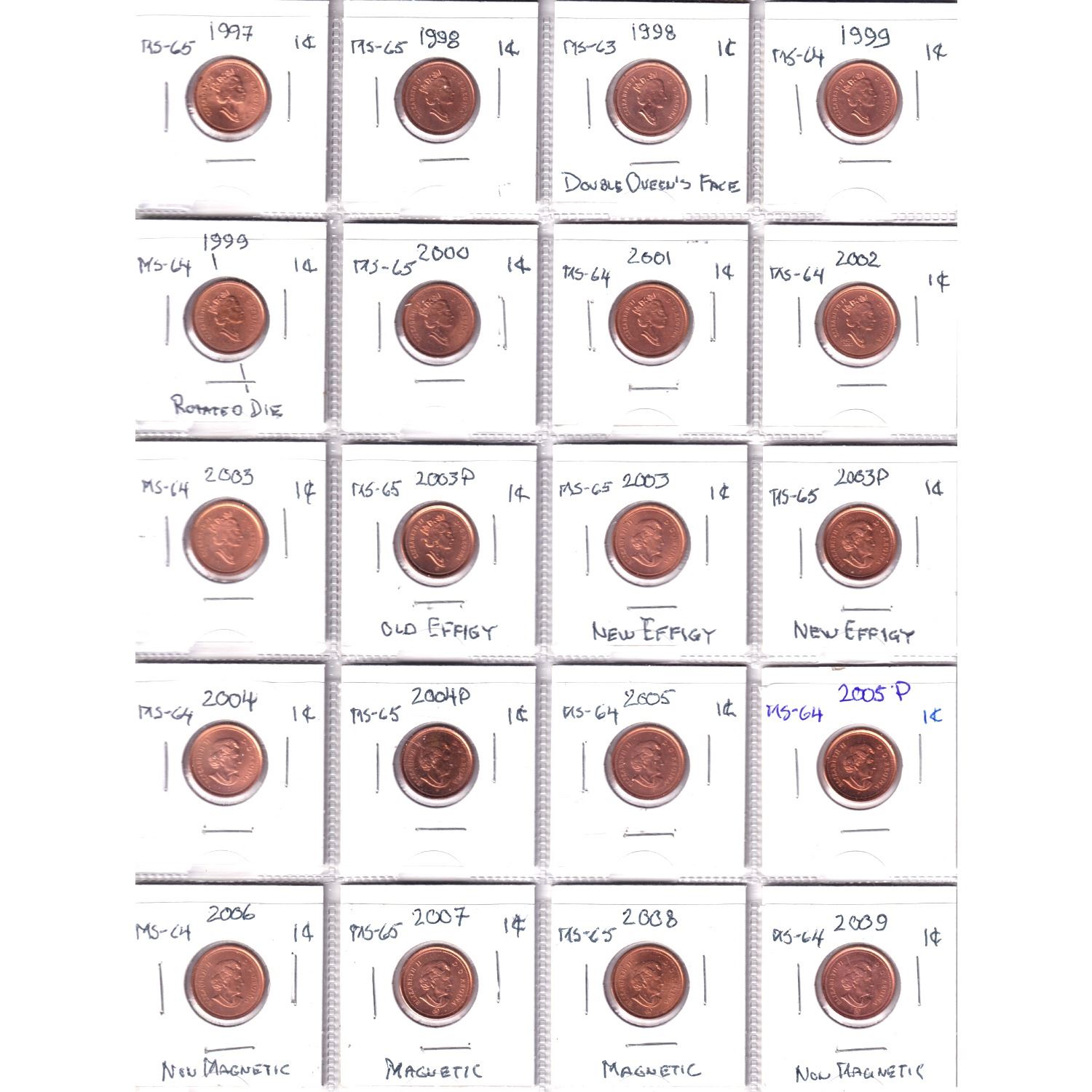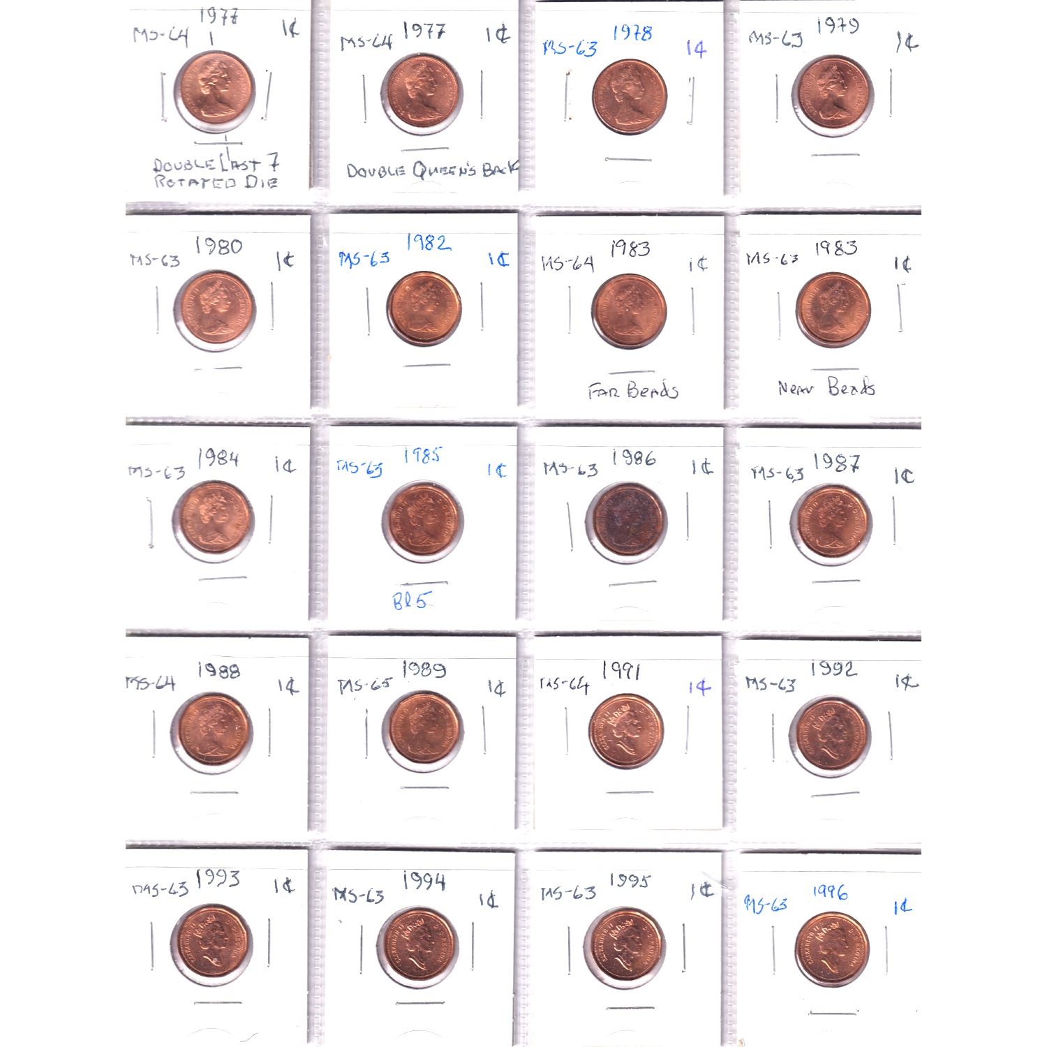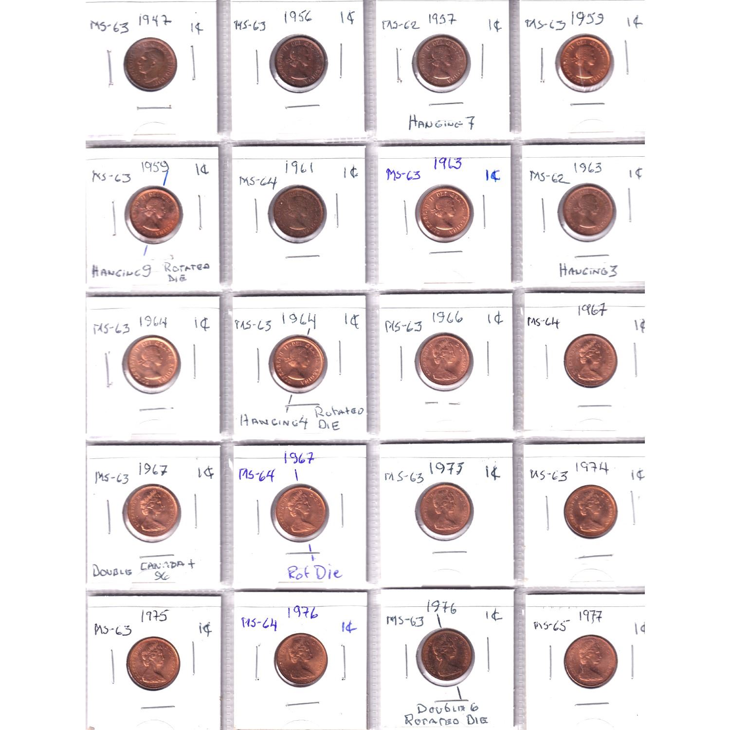 1947-2012 Canada 1-cent coins: lot includes various grade from MS-62 up to MS-65, lot contains many varieties such as rotated dies, Doubling and Hanging varieties. Please view image for details. 65pcs