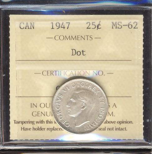 1947 25¢ Dot ICCS MS62 lightly toned. Popular and possibly underrated.