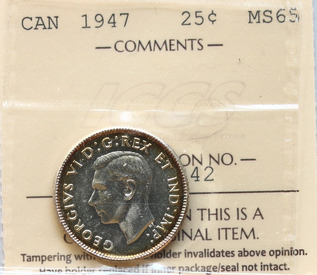 1947 25¢ ICCS Gem Mint State-65. Gem white with light golden perimeter tones.
