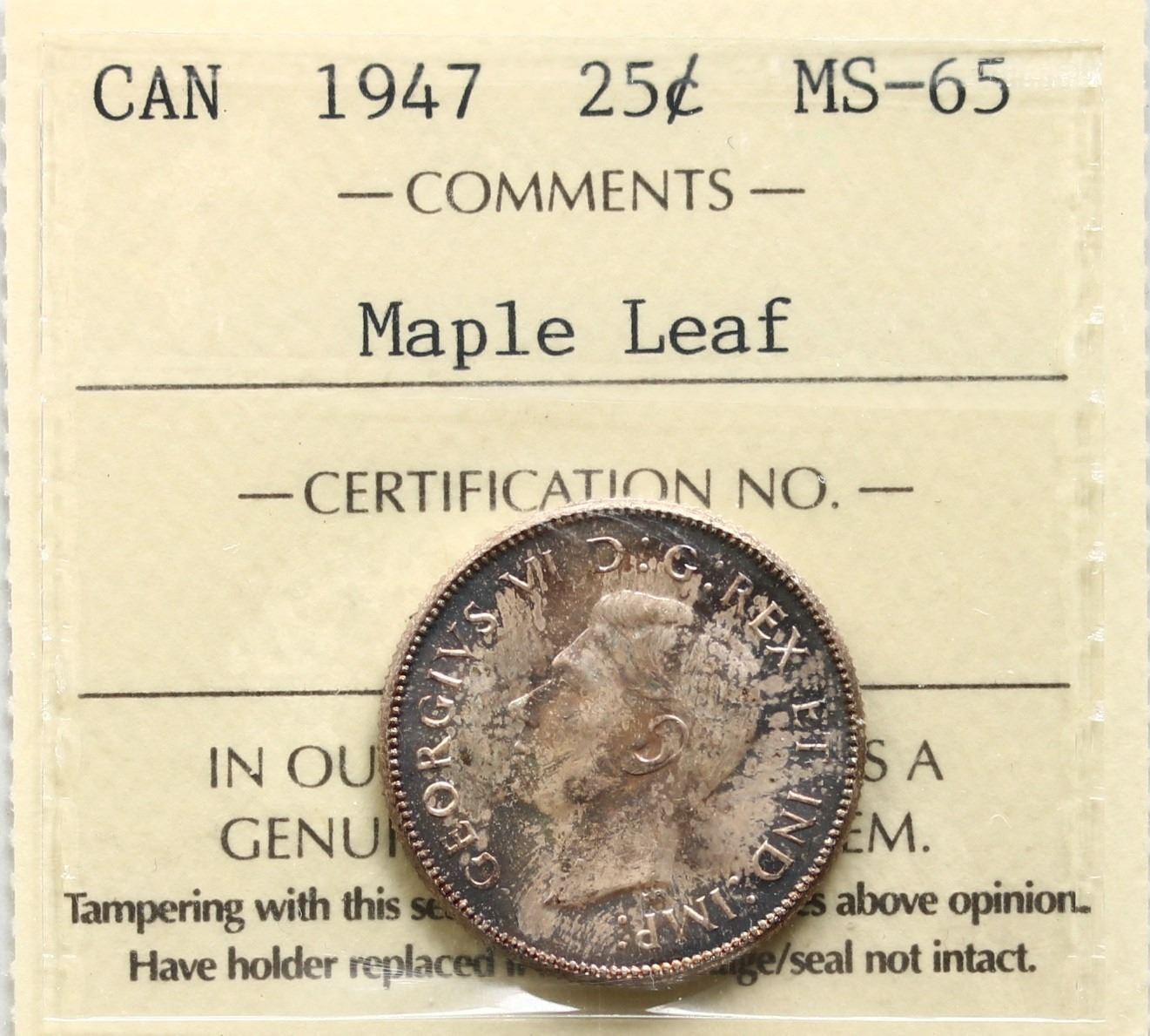 1947 25¢ "Maple Leaf" ICCS Gem Mint State-65 Tone of multiple shades