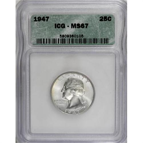 <B>1947 25C MS67 ICG.</B></I> NGC Census: (179/1). PCGS Population (53/0). Mintage: 22,556,000. Numismedia Wsl. Price for NGC/PCGS coin in MS67: $180. (#5833)<BR><BR><B>Coin Engraver:</B> John Flanagan<BR><BR><b>Shipping:</b> Coins & Currency (<a target="_blank" href="http://www.heritageauctions.com/common/shipping.php">view shipping information</a>)