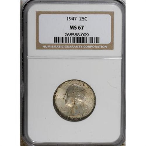 <B>1947 25C MS67 NGC.</B></I> NGC Census: (179/1). PCGS Population (52/0). Mintage: 22,556,000. Numismedia Wsl. Price for NGC/PCGS coin in MS67: $180. (#5833)<BR><BR><B>Coin Engraver:</B> John Flanagan<BR><BR><b>Shipping:</b> Coins & Currency (<a target="_blank" href="http://www.heritageauctions.com/common/shipping.php">view shipping information</a>\)