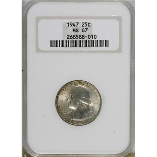 <B>1947 25C MS67 NGC.</B></I> NGC Census: (180/1). PCGS Population (53/0). Mintage: 22,556,000. Numismedia Wsl. Price for NGC/PCGS coin in MS67: $180. (#5833)<BR><BR><B>Coin Engraver:</B> John Flanagan<BR><BR><b>Shipping:</b> Coins & Currency (<a target="_blank" href="http://www.heritageauctions.com/common/shipping.php">view shipping information</a>)
