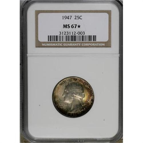 <B>1947 25C MS67<img src="/images/star.gif" width="10" height="10" alt="" border="0"> NGC.</B></I> NGC Census: (180/1). PCGS Population (53/0). Mintage: 22,556,000. Numismedia Wsl. Price for NGC/PCGS coin in MS67: $180. (#5833)<BR><BR><B>Coin Engraver:</B> John Flanagan<BR><BR><b>Shipping:</b> Coins & Currency (<a target="_blank" href="http://www.heritageauctions.com/common/shipping.php">view shipping information</a>)