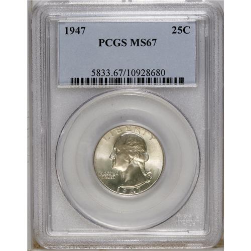 1947 25C MS67 PCGS. A smooth satiny sheen illuminates