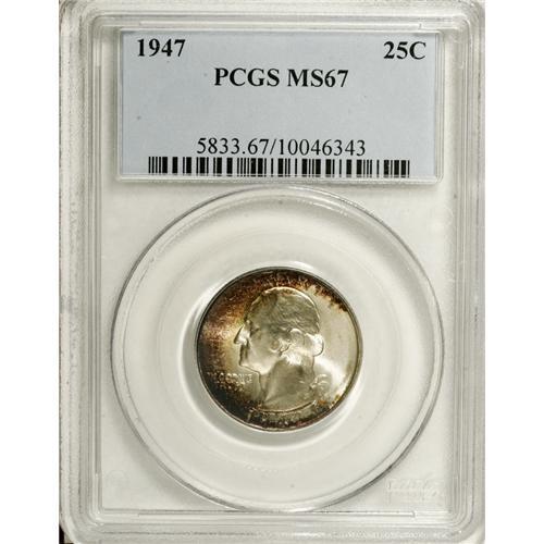 <B>1947 25C MS67 PCGS.</B></I> Highly lustrous, boldly impressed, and untoned save for crescents of crimson and plum toning at the left obverse and right reverse periphery. This Superb Gem is tied for the finest certified by PCGS (12/06).<BR><BR><b>Shipping:</b> Coins & Currency (<a target="_blank" href="http://www.heritageauctions.com/common/shipping.php">view shipping information</a>)