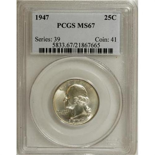 <B>1947 25C MS67 PCGS.</B></I> PCGS Population (52/0). NGC Census: (179/1). Mintage: 22,556,000. Numismedia Wsl. Price for NGC/PCGS coin in MS67: $180. (#5833)<BR><BR><B>Coin Engraver:</B> John Flanagan<BR><BR><b>Shipping:</b> Coins & Currency (<a target="_blank" href="http://www.heritageauctions.com/common/shipping.php">view shipping information</a>)