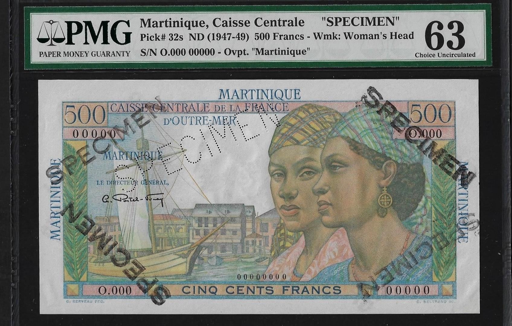 One 1947-49 Martinique 500 Francs Specimen Note Pick# 32s PMG Choice Uncirculated 63. PMG Certified.