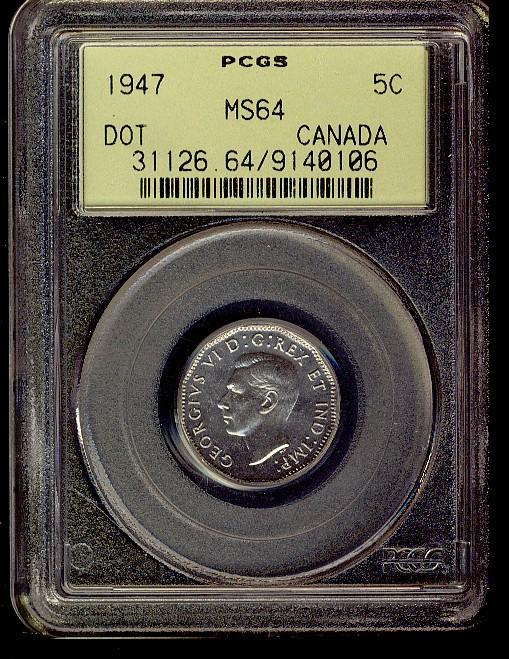 1947 5¢ Dot PCGS MS64. Tough issue for grade in old PCGS holder.