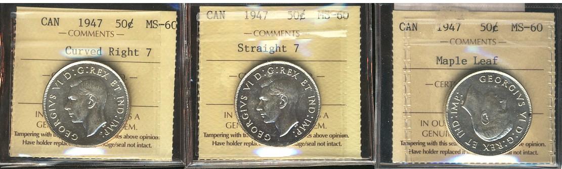 1947 50¢ C7R, St7 & ML ICCS MS60. Lot of 3 coins.