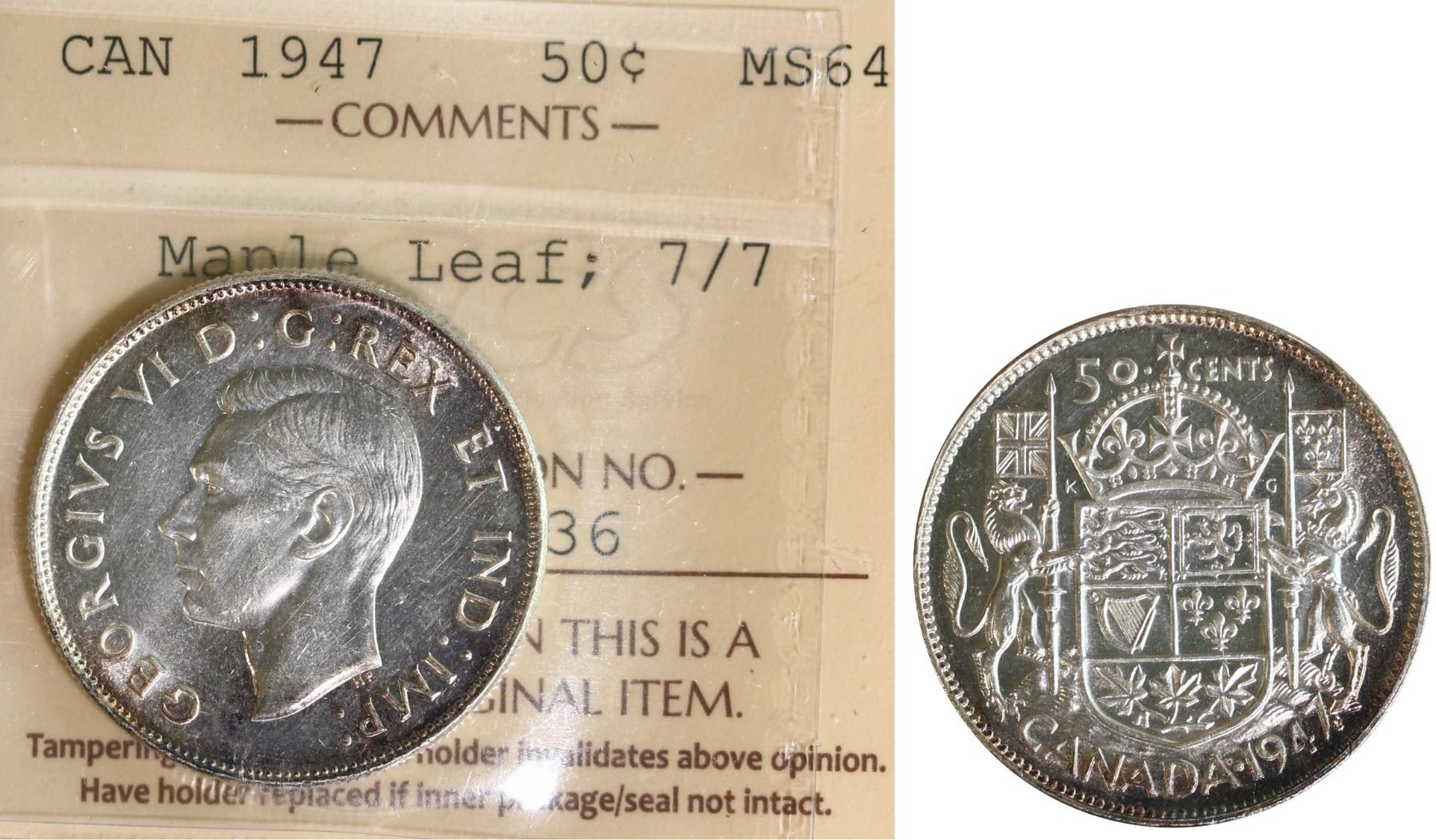 1947 50¢ "ML - 7/7" ICCS Very Choice Mint State-64 brilliant and lustrous with delicate russet tone.