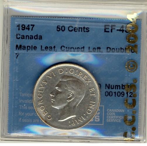 1947 50¢ ML C7L, Doubled 7 CCCS EF45. A nice visible dbl strike.