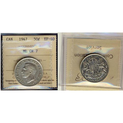 1947 50¢ ML CR7 ICCS EF40, a rare and solid example. Top 3 cencus.