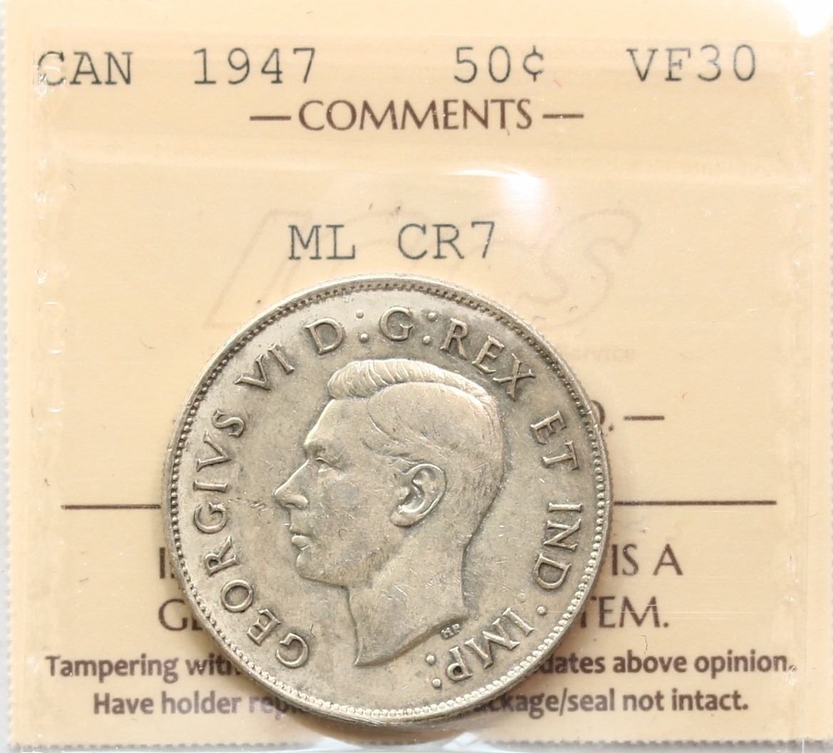 1947 50¢ "ML, Curved Right 7" ICCS Choice Very Fine-30. Very scarce variety and seldom offered in this grade. A nice and problem free example. Worth a premium bid.