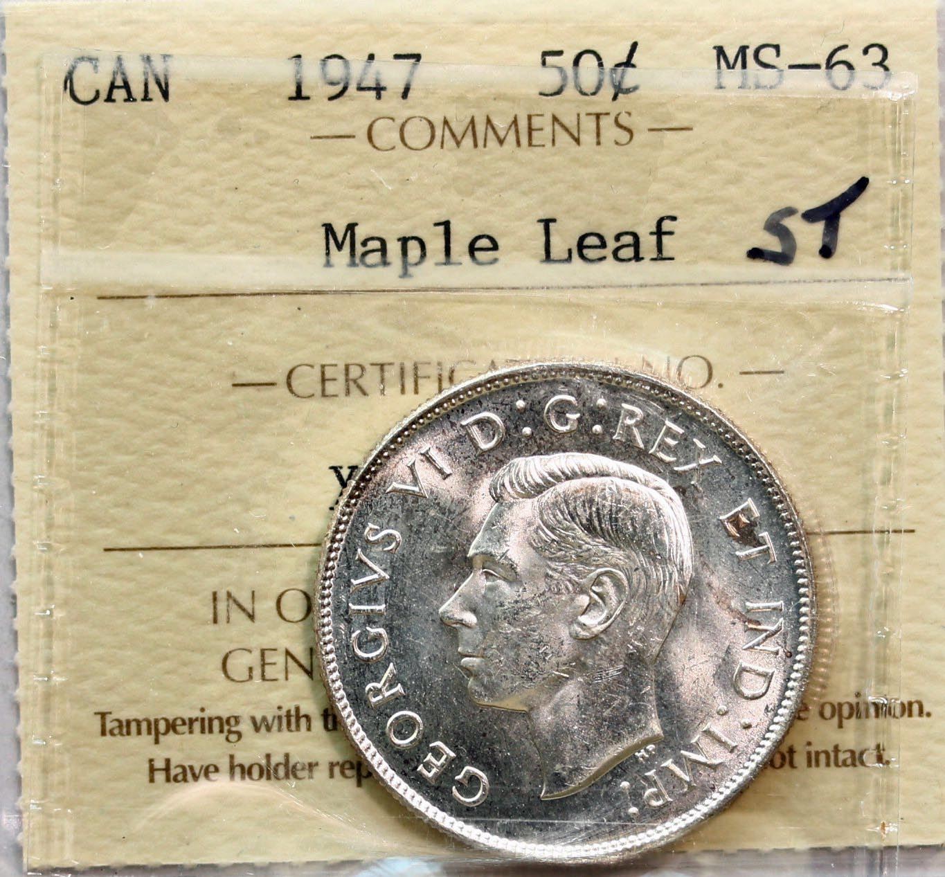 1947 50¢ ML ICCS Choice Mint State-63. Bright full white example.