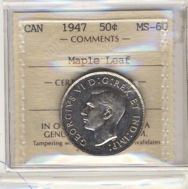 1947 50¢ ML ICCS MS60. Hint of golds.