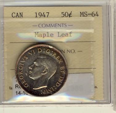 1947 50¢ ML ICCS MS64. Light shades of gold.