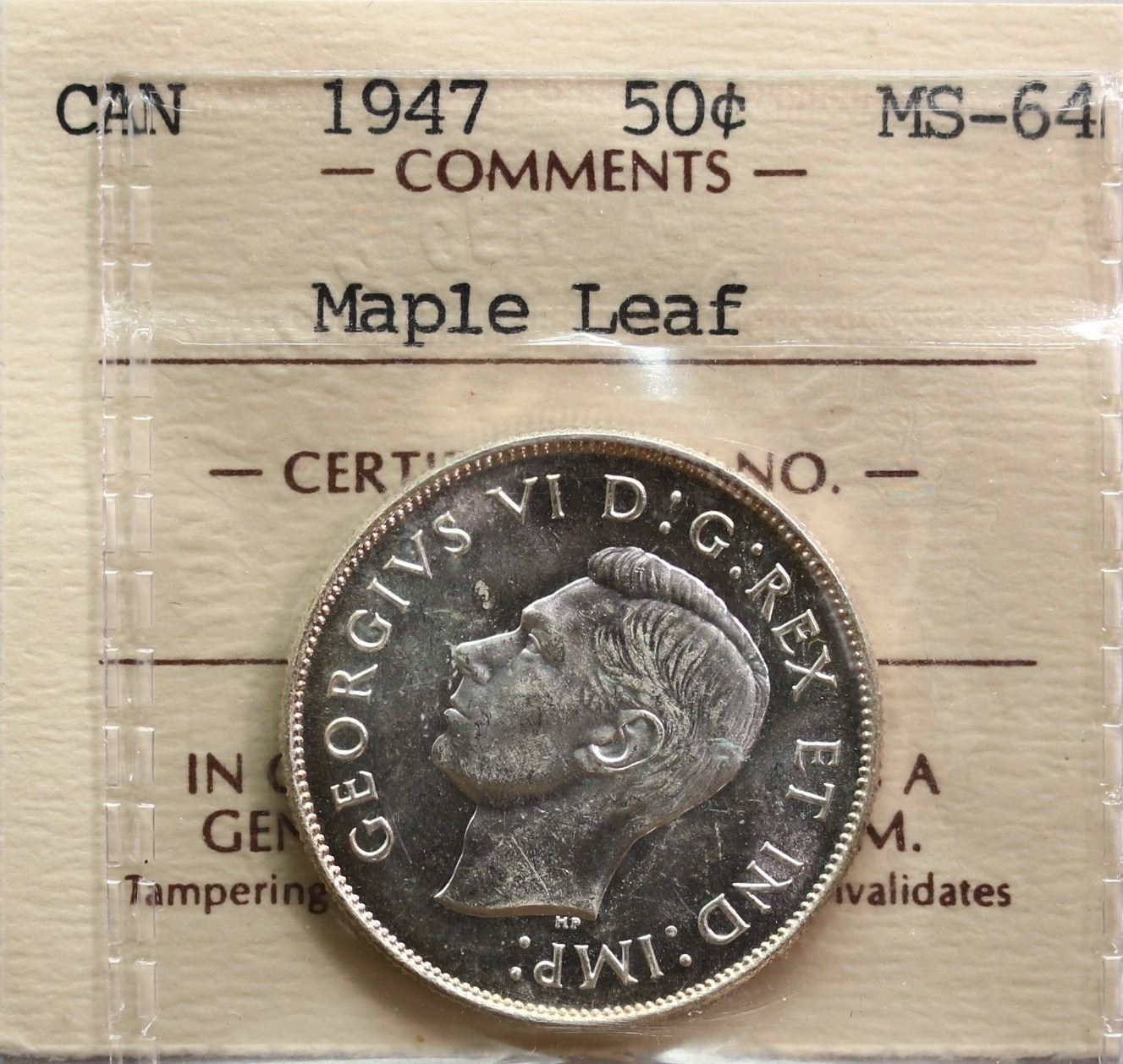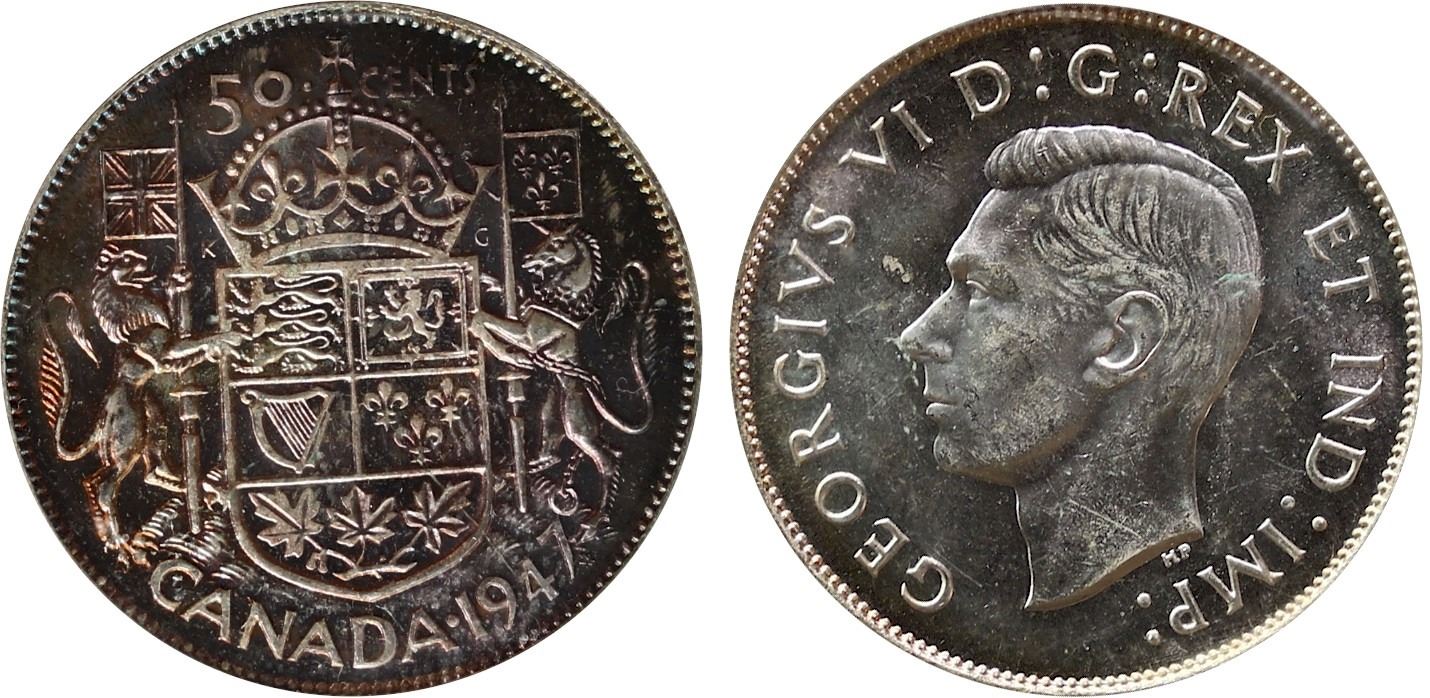 1947 50¢ "Maple Leaf" ICCS Choice Mint State-64, Brilliant and lustrous.