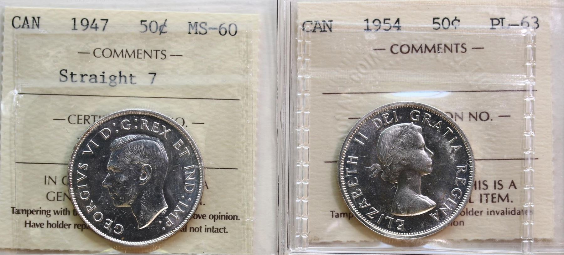 1947 50¢ "Straight 7", 1954. Both coins ICCS Mint State-60 to Choice Proof-Like-63