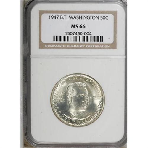 <B>1947 50C Booker T. Washington MS66 NGC.</B></I> NGC Census: (93/3). PCGS Population (124/4). Mintage: 100,017. Numismedia Wsl. Price for NGC/PCGS coin in MS66: $550. (#9408)<BR><BR><b>Shipping:</b> Coins & Currency (<a target="_blank" href="http://www.heritageauctions.com/common/shipping.php">view shipping information</a>)
