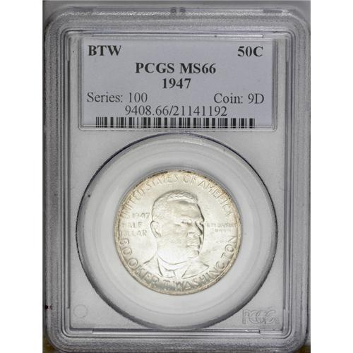<B>1947<50C> Booker T. Washington MS66 PCGS.</B></I> This example is sharply detailed with frosty silver luster. The obverse has delicate champagne color with darker golden-brown toning confined to the extreme outer border. The reverse is fully brilliant. This is essentially the finest available, although PCGS has certified two coins in higher grades (4/06).