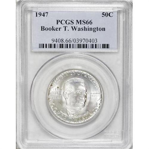 <B>1947 50C Booker T. Washington MS66 PCGS.</B></I> PCGS Population (121/3). NGC Census: (94/3). Mintage: 100,017. Numismedia Wsl. Price for NGC/PCGS coin in MS66: $550. (#9408)<BR><BR><b>Shipping:</b> Coins & Currency (<a target="_blank" href="http://www.heritageauctions.com/common/shipping.php">view shipping information</a>)