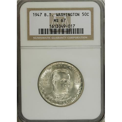 <B>1947 50C Booker T. Washington MS67 NGC.</B></I> A rich band of orange and apple-green graces the right reverse border, but the remainder of this lustrous Superb Gem is nearly brilliant. Nicely struck for the Booker T. Washington type, which invariably has minor softness on portions of the portrait. Census: 5 in 67, 0 finer (1/07).<BR><BR><b>Shipping:</b> Coins & Currency (<a target="_blank" href="http://www.heritageauctions.com/common/shipping.php">view shipping information</a>)