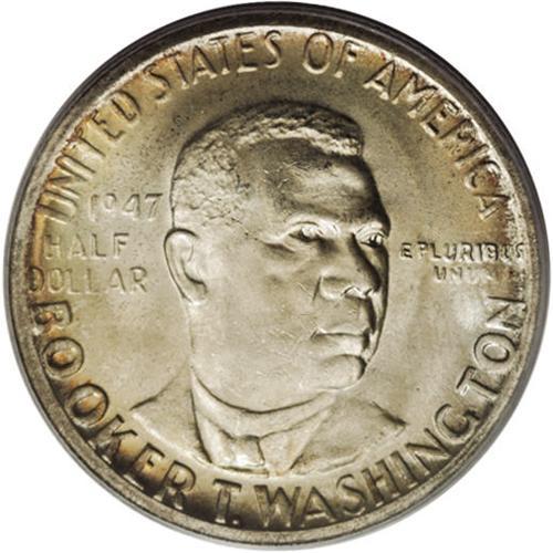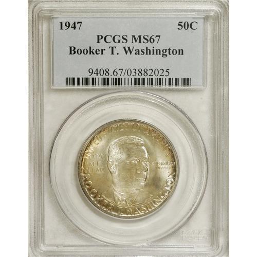 <B>1947 50C Booker T. Washington MS67 PCGS.</B></I> Many Booker T. Washington halves received rough handling at the various mints, and collector complaints were common, particularly about abrasions on the chin. Bowers (1991) cites a Mr. Hisken from Seattle who ordered 10 sets of 1947 coins and returned them all, having found none to his satisfaction. The condition of this Superb Gem, however, leaves no room for complaint. The highly lustrous and practically mark-free surfaces display rich tan-gold patina in the obverse fields and silver-gray toning elsewhere on the coin. Population: 3 in 67, 0 finer (3/07).<BR><I>From The Cary & Cheryl Porter Collection.</B></I><BR><BR><b>Shipping:</b> Coins & Currency (<a target="_blank" href="http://www.heritageauctions.com/common/shipping.php">view shipping information</a>)