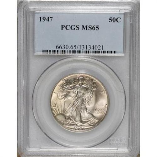 <B>1947 50C MS65 PCGS.</B></I> PCGS Population (2833/790). NGC Census: (2249/591). Mintage: 4,094,000. Numismedia Wsl. Price for NGC/PCGS coin in MS65: $180. (#6630)<BR><BR><b>Shipping:</b> Coins & Currency (<a target="_blank" href="http://www.heritageauctions.com/common/shipping.php">view shipping information</a>)