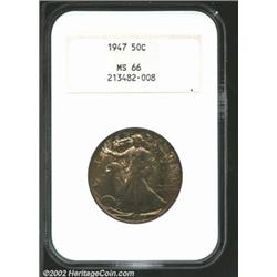 1947 50C MS66 NGC. Deeply and originally toned in shadings of emerald-green, rose, and gray with an occasional speckling of original brilliance peeking through. Fully struck. Important notice: We expect to be auctioning lots at the rate of 200-250 per hour. Sometimes eBay Premier live bid software cannot keep up with that pace, so we strongly recommend that you place a realistic proxy bid now as insurance to avoid disappointment. Also please note that all Heritage/CAA lots purchased through eBay Premier carry a 20% Buyer's Premium. Please make sure you read the Terms and Conditions.