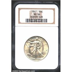 1947 50C MS66 NGC. This is a fully lustrous, frosty finished Gem with delicate golden tinting and a smooth, high quality sheen. Solidly graded with eye appeal to spare. Important notice: We expect to be auctioning lots at the rate of 200-250 per hour. Sometimes eBay Premier live bid software cannot keep up with that pace, so we strongly recommend that you place a realistic proxy bid now as insurance to avoid disappointment. Also please note that all Heritage/CAA lots purchased through eBay Premier carry a 20% Buyer's Premium. Please make sure you read the Terms and Conditions.