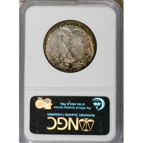 <B>1947 50C MS66 NGC.</B></I> Medium intensity golden-orange toning with crimson and aqua-blue accents bathes the obverse, while the reverse displays an array of multicolored patina. Sharply struck, including good definition on Liberty's thumb. Both sides are impeccably preserved.<BR><BR><B>Coin Engraver:</B> Adolph A. Weinman<BR><BR><b>Shipping:</b> Coins & Currency (<a target="_blank" href="http://www.heritageauctions.com/common/shipping.php">view shipping information</a>)