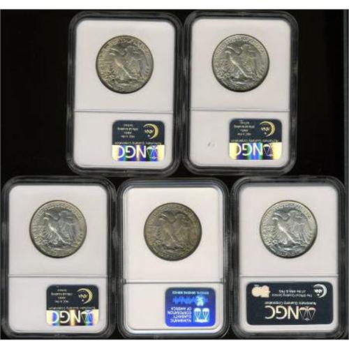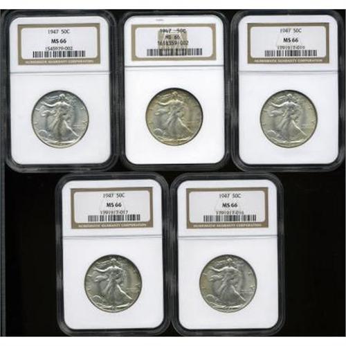 <B>(5)1947 50C MS66 NCG.</B></I><BR><BR><B>Coin Engraver:</B> Adolph A. Weinman<BR><BR><b>Shipping:</b> Coins & Currency (<a target="_blank" href="http://www.heritageauctions.com/common/shipping.php">view shipping information</a>)
