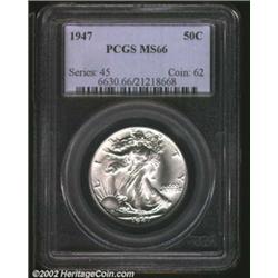 1947 50C MS66 PCGS. A brilliant, flashy, and sharply struck Gem with exquisite surfaces. A splendid final-year representative. Important notice: We expect to be auctioning lots at the rate of 200-250 per hour. Sometimes eBay Premier live bid software cannot keep up with that pace, so we strongly recommend that you place a realistic proxy bid now as insurance to avoid disappointment. Also please note that all Heritage/CAA lots purchased through eBay Premier carry a 20% Buyer's Premium. Please make sure you read the Terms and Conditions.