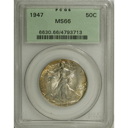 <B>1947 50C MS66 PCGS.</B></I> A delightful Premium Gem with satiny silver luster beneath gorgeous gold and iridescent toning. The obverse is nearly immaculate, while the reverse has only a couple of ticks. Housed in an old green holder.<BR><BR><b>Shipping:</b> Coins & Currency (<a target="_blank" href="http://www.heritageauctions.com/common/shipping.php">view shipping information</a>)