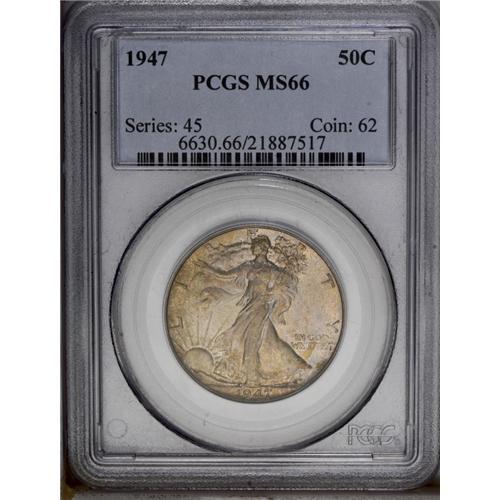 <B>1947<50C> MS66 PCGS.</B></I> Lovely variegated toning covers each side of this well struck Premium Gem. Carefully preserved and blemish-free, with full glowing luster. <BR><BR><B>Important notice:</B> Heritage usually auctions material at the rate of 200-250 lots per hour. On some occasions eBay Live bid software or the Internet may not be able to keep up with the pace of the auction. We recommend placing a realistic absentee bid now as insurance to avoid disappointment. Occasionally the auctioneer may eliminate or reject an eBay Live bid, and the auctioneer may also reopen a lot after the close of the eBay live bidding (usually because we missed an audience bid), and may reject your bid even if it shows you as the winning bidder. By bidding via eBay Live, you agree that Heritage may award the lot to another bidder at its sole discretion under the circumstances described above or any other reasonable circumstances. Since eBay bids are not shown to us until we open the lot on the floor, we treat those bids just like floor bids. In most cases the floor responds before the eBay bid is presented to us, due to Internet lag time, so for consistency we have made it a policy that floor bids are always considered first over tie eBay live bids. Also please note that all Heritage lots purchased through eBay Live carry a 20% Buyer's Premium. Please make sure you read the Terms and Conditions before you bid. This lot is being auctioned in conjunction with a live floor auction by Heritage Galleries & Auctioneers. All final auction and invoice information will be supplied by Heritage Galleries & Auctioneers, and all other information should be considered preliminary. Lot:3030 <BR><BR><B>Winning Notification and Billing:</B> After the FINAL session in this auction is complete, Heritage will send e-mail and snail mail invoices. This process normally takes several days. All final auction and invoice information will be supplied by Heritage Galleries & Auctioneers, and all other information should be considered preliminary. <BR><BR>This auction will be conducted on a live auction floor and over the Internet through eBay Live. If you choose to place an absentee bid, please take a moment to <font color='#0000ff'><u><a href='http://pages.ebay.com/liveauctions/help/before/laabsentee.html'>learn how eBay Live absentee bidding works</a></u></font><font color='#000000'>