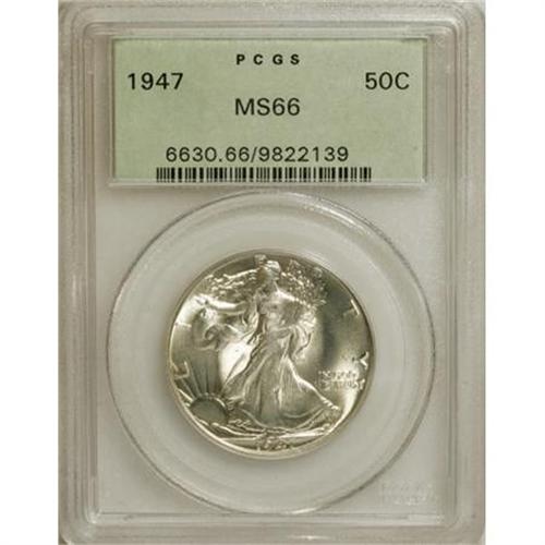 <B>1947 50C MS66 PCGS.</B></I> PCGS Population (787/19). NGC Census: (547/50). Mintage: 4,094,000. Numismedia Wsl. Price for NGC/PCGS coin in MS66: $320. (#6630)<BR><BR><B>Coin Engraver:</B> Adolph A. Weinman<BR><BR><b>Shipping:</b> Coins & Currency (<a target="_blank" href="http://www.heritageauctions.com/common/shipping.php">view shipping information</a>\)