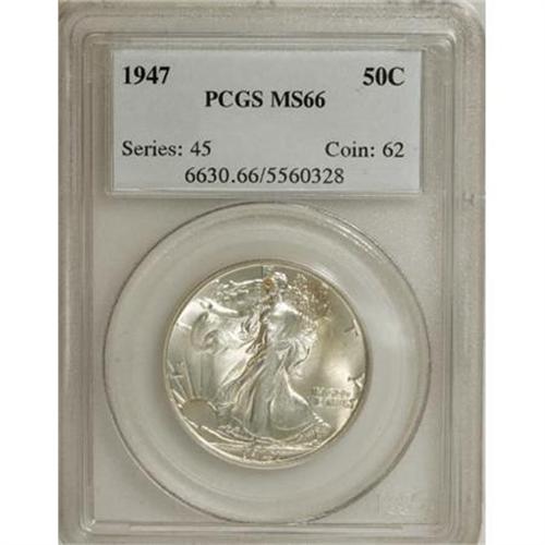 <B>1947 50C MS66 PCGS.</B></I> PCGS Population (798/19). NGC Census: (549/50). Mintage: 4,094,000. Numismedia Wsl. Price for NGC/PCGS coin in MS66: $320. (#6630)<BR><BR><B>Coin Engraver:</B> Adolph A. Weinman<BR><BR><b>Shipping:</b> Coins & Currency (<a target="_blank" href="http://www.heritageauctions.com/common/shipping.php">view shipping information</a>)