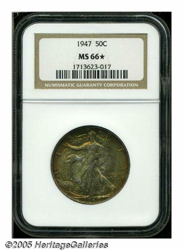 <B>1947<50C> MS66 <S NGC.</B></I> Deep orange and apple-green colors bathe this well struck and vibrantly lustrous premium Gem. The reverse is virtually pristine, and the obverse is also impressively unmarked. Population: 4 in 66 <S, none finer with a star designation (4/05).