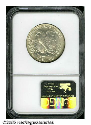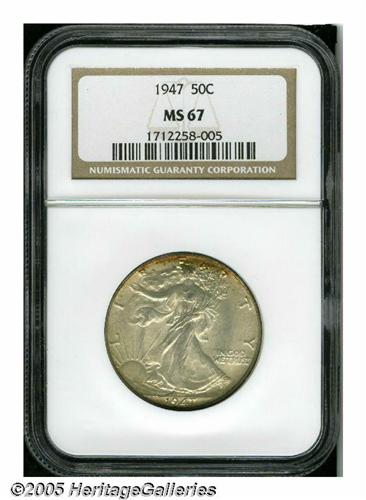 <B>1947<50C> MS67 NGC.</B></I> This is a satiny Gem example of the final year of issue with ivory color over frosty luster. Hints of gold toning may be seen at the borders, especially above Liberty's head. Although this is not a fully struck specimen, it is clearly finer than the typical survivor. Population: 42 in 67, 0 finer (6/05).<BR><I>From The Robert Moreno Collection.</B></I>