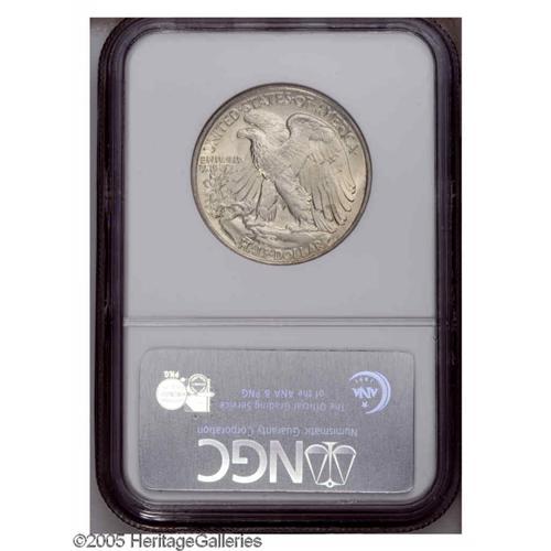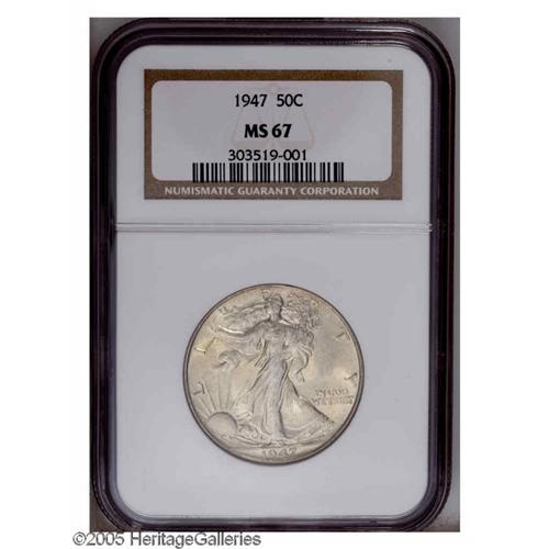 <B>1947<50C> MS67 NGC.</B></I> This issue's original mintage of 4 million pieces is considerably lower than that of the other P-mint Walkers from the 1940s. Its status as a final-date issue, however, ensured that the 1947 survived in Mint State in significant numbers. On the other hand, the '47-P is conditionally rare as a Superb Gem. A simply beautiful coin to behold, both sides are sharply impressed with full mint luster shimmering beneath pastel-golden iridescence. The number of small blemishes is typically minimal for the assigned grade, and none are singularly distracting. Census: 45 in 67, 0 finer (11/05).