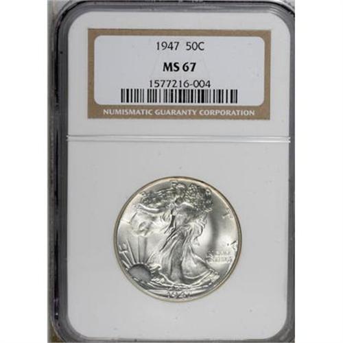 <B>1947 50C MS67 NGC.</B></I> Boldly struck with good detail on Liberty's head and branch hand, and a swirling satiny sheen across both sides that ensures a high degree of eye appeal for this impressive Superb Gem. Both sides of the piece are entirely free of toning and remarkably well preserved. An outstanding specimen from the final year of the Walking Liberty half dollar series. Census: 50 in 67, 0 finer (9/07). <BR><BR><B>Coin Engraver:</B> Adolph A. Weinman<BR><BR><b>Shipping:</b> Coins & Currency (<a target="_blank" href="http://www.heritageauctions.com/common/shipping.php">view shipping information</a>)