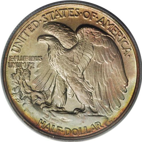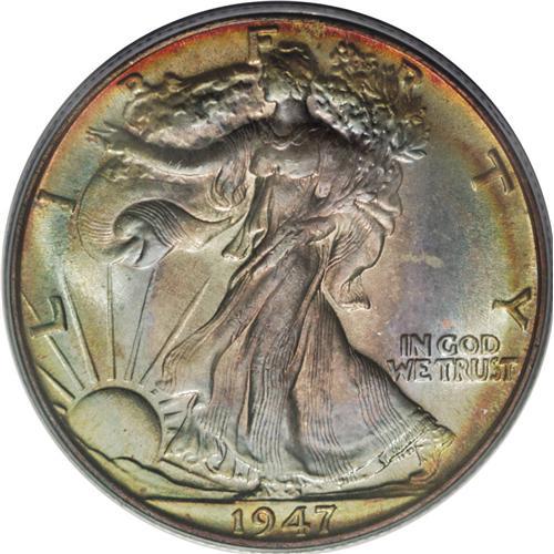 <B>1947 50C MS67 PCGS.</B></I> Ex: GBW. Spectacular, indeed memorable quality for this final Philadelphia Mint Walker. Many of the Superb examples of 1947 and 1947-D half dollars began as mint set coins from the government issued double mint sets sold by the Treasury Department from 1947 through 1958, with a one-year hiatus in 1950. Such is likely the case with this beautifully toned representative. The obverse exhibits concentric shades of golden-orange and sky-blue toning while a crescent of rich coppery-gold color accents the lower portion of the reverse. Population: 19 in 67, 0 finer (11/06).<BR><I>From The Temecula Collection.</B></I><BR><BR><b>Shipping:</b> Coin/Currency (<a target="_blank" href="http://www.heritageauctions.com/common/shipping.php">view shipping information</a>)