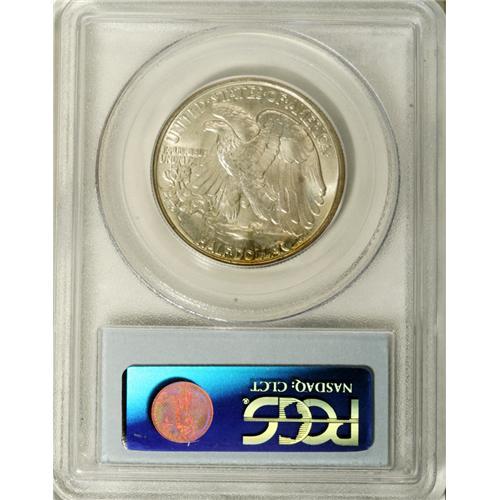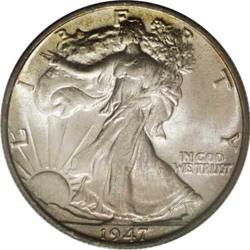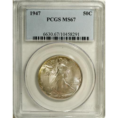 <B>1947 50C MS67 PCGS.</B></I> The obverse is beautifully toned silver-blue and pale green, while the reverse has ice-blue patina with a drop of lemon-gold at the lower periphery. The luster is pleasing and the strike is unusually sharp on this Superb Gem, which is tied for the finest certified by either NGC or PCGS (12/06).<BR><BR><b>Shipping:</b> Coin/Currency (<a target="_blank" href="http://www.heritageauctions.com/common/shipping.php">view shipping information</a>)
